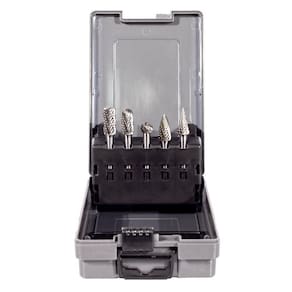 Para uso somente em retíficas altas velocidades . Jogo Com 5 Peças. Bitola mm : 10. Haste mm : 6. Conteúdo da Embalagem: 5 Limas Rotativas Metal Duro MD Dentes Cruzados para Aço: Cilíndrica - Árvore Pontiaguda - Cilíndrica com Raio - Esférica - Cônica.