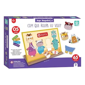 Contém: 65 peças magnéticas com roupas e acessórios, 01 adesivo, 01 painel de metal grande (35,0 x 25,0 cm) e 01 base em madeira.