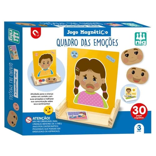 Jogo Magnético - Quadro Das Emoções - Nig Brinquedos O Jogo Magnético Quadro das Emoções da Nig Brinquedos é uma ferramenta valiosa para ajudar crianças pequenas a expressarem e entenderem suas emoções. Ideal para pais e cuidadores, o jogo permite que a criança identifique e nomeie suas emoções de forma lúdica e interativa. Com 30 peças magnéticas, incluindo o nome dos sentimentos, seus emojis e expressões faciais, as crianças podem escolher uma cartinha, reconhecer a emoção representada e montar seu painel. Essa atividade não apenas auxilia no desenvolvimento da inteligência emocional, mas também oferece um suporte importante para que as crianças expressem o que sentem e busquem ajuda quando necessário. Código: 103612 Dimensões aprox. da embalagem em cm: 6x31x24 Peso liq. Aproximado do produto na embalagem: 848g Referência do modelo: 0465 Certificado Inmetro: 009078/2023 Conteúdo da embalagem: 30 peças Composição/material: madeira mdf, papel microondulado, adesivos, peças imantadas, papel cartonado Garantia: 90 dias contra defeitos de fabricação pelo fabricante. Imagens meramente ilustrativas. As cores e tonalidades podem variar. Gênero - Meninas Meninos Unissex Idade - 4 anos 5 anos 6 anos 7 anos 8 Anos 9 anos Tipo - Habilidade Jogo de Tabuleiro Jogo Pedagógico Kit Experiências Raciocínio Lógico