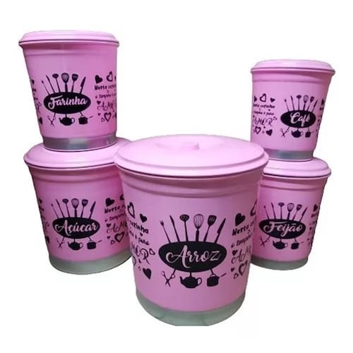 Bem vindo a loja Coisas & Trecos, aqui você encontra de tudo para sua cozinha!Feitos em alumínio , os potes para mantimentos ajudam você a manter seus alimentos guardados por mais tempo e mantém a sua cozinha sempre organizada. O conjunto é comporto por 5 peças de tamanhos diferentes decorado.Especificações:Material: 100% alumínioDesenho: pintado- Capacidade:- Pote Nº 1: 14 cm diâmetro - 500g café- Pote Nº 2: 16 cm diâmetro - 1kg farinha- Pote Nº 3: 18 cm diâmetro - 1kg açúcar- Pote Nº 4: 20 cm diâmetro - 2kg feijão- Pote Nº 5: 22 cm diâmetro - 5kg arroz- Aproximadamente- PRODUTO EM ESTOQUE A PRONTA ENTREGA------------------------------------------------------------------------------------------------- BOAS COMPRAS !