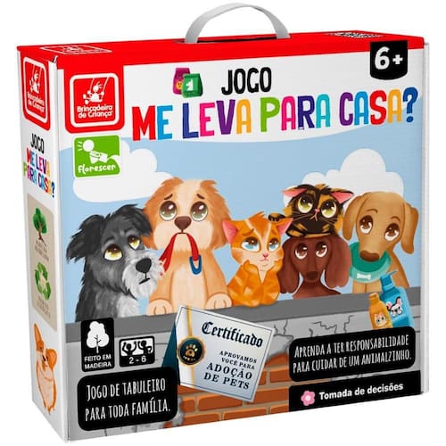 Jogo Me Leva para Casa - Brincadeira de Criança O Jogo - Me leva para casa? é adequado para jogar com os amigos e com toda a família. Consiste em percorrer o caminho do tabuleiro, contando com a sorte e com a habilidade de responder perguntas sobre cães, gatos e seus devidos cuidados. É um jogo instrutivo e educativo, pois ao mesmo tempo que ele diverte, também ensina a tomar consciência das necessidades e do bem-estar dos nossos amigos de quatro patas. Este jogo auxilia no desenvolvimento do pensamento crítico e da tomada decisões. Selo Inmetro: 006331/2021