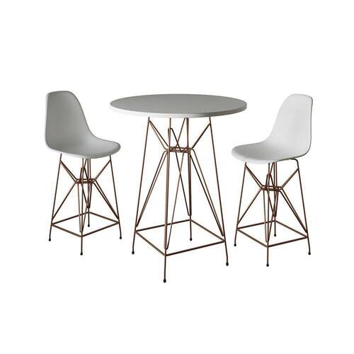 Jogo Mesa Bistrô Eames Branca 60cm 2 Banquetas Branca Base Ferro CobreO Jogo de Mesa e Banqueta Bistrô Eames possui um design moderno cheio de charme, fabricado com material de alta qualidade, proporcionando o melhor conforto e sem perder o estilo. A banqueta possui uma curvatura ergonômica que se encaixa perfeitamente ao corpo, ficando ainda mais completo com a mesa.Tipo: ConjuntoModelo: Eames BistrôCor Tampo da Mesa: BrancoCor Assento da Banqueta: BrancoCor da Base: CobreCARACTERÍSTICASBase: FerroTampo da Mesa: MDFAssento: Plástico polipropilenoDIMENSÕES DA BANQUETAAltura: 101,5cmAltura assento até o chão: 70,5cmLargura: 40cmComprimento: 40cmDIMENSÕES DA MESAAltura: 100cmDiâmetro: 60cmLargura base: 40cmComprimento base: 40cmIMAGENS MERAMENTE ILUSTRATIVAS, PODENDO HAVER UMA PEQUENA VARIAÇÃO NA COR DEPENDENDO DE CADA TELA OU MONITOR.Jogo Mesa Bistrà Eames Branca 60cm 2 Banquetas Branca Base Ferro Cobre