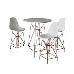 Jogo Mesa Bistrô Eames Branca 60cm 3 Banquetas Branca Base Ferro CobreO Jogo de Mesa e Banqueta Bistrô Eames possui um design moderno cheio de charme, fabricado com material de alta qualidade, proporcionando o melhor conforto e sem perder o estilo. A banqueta possui uma curvatura ergonômica que se encaixa perfeitamente ao corpo, ficando ainda mais completo com a mesa.Tipo: ConjuntoModelo: Eames BistrôCor Tampo da Mesa: BrancoCor Assento da Banqueta: BrancoCor da Base: CobreCARACTERÍSTICASBase: FerroTampo da Mesa: MDFAssento: Plástico polipropilenoDIMENSÕES DA BANQUETAAltura: 101,5cmAltura assento até o chão: 70,5cmLargura: 40cmComprimento: 40cmDIMENSÕES DA MESAAltura: 100cmDiâmetro: 60cmLargura base: 40cmComprimento base: 40cmIMAGENS MERAMENTE ILUSTRATIVAS, PODENDO HAVER UMA PEQUENA VARIAÇÃO NA COR DEPENDENDO DE CADA TELA OU MONITOR.