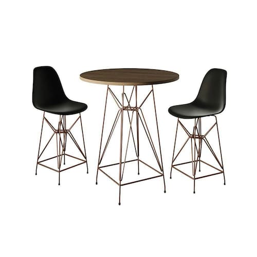Jogo Mesa Bistrô Eames Tampo Amêndoa 60cm 2 Banquetas Preta Base Ferro CobreO Jogo de Mesa e Banqueta Bistrô Eames possui um design moderno cheio de charme, fabricado com material de alta qualidade, proporcionando o melhor conforto e sem perder o estilo. A banqueta possui uma curvatura ergonômica que se encaixa perfeitamente ao corpo, ficando ainda mais completo com a mesa.Tipo: ConjuntoModelo: Eames BistrôCor Tampo da Mesa: AmêndoaCor Assento da Banqueta: PretoCor da Base: CobreCARACTERÍSTICASBase: FerroTampo da Mesa: MDFAssento: Plástico polipropilenoDIMENSÕES DA BANQUETAAltura: 101,5cmAltura assento até o chão: 70,5cmLargura: 40cmComprimento: 40cmDIMENSÕES DA MESAAltura: 100cmDiâmetro: 60cmLargura base: 40cmComprimento base: 40cmIMAGENS MERAMENTE ILUSTRATIVAS, PODENDO HAVER UMA PEQUENA VARIAÇÃO NA COR DEPENDENDO DE CADA TELA OU MONITOR.Jogo Mesa Bistrà Eames Tampo AmÃndoa 60cm 2 Banquetas Preta Base Ferro Cobre