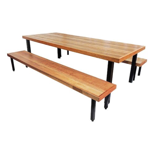 Madeira Maciça Formato: Retangular Material do Tampo: Madeira Nobre e Maciça Material dos Assentos: Madeira Nobre e Maciça Material dos Pés: Ferro Acabamento dos Pés: Pintura Epóxi Eletrostática Nivelamento dos Pés: Sim