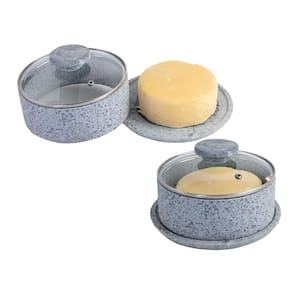 01 - boleira / queijeira de pedra com tampa de vidro; 01 - manteigueira francesa de pedra 200g; 04 - pratos 18 cm de diâmetro; 04 - xícaras de chá com pires;