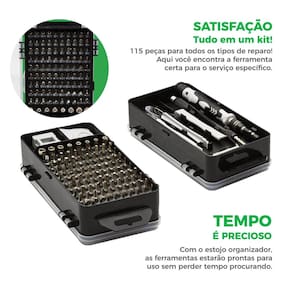 O conjunto de ferramentas kokay, com 115 peças, foi especialmente desenvolvido para atender a trabalhos de reparos técnicos que exigem precisão e qualidade . É a escolha ideal para quem busca eficiência e versatilidade em um único estojo. Especificações técnicas: - material: aço cromo vanádio - estojo compacto e funcional - aplicações: ideal para o reparo de celulares, laptops, relógios de pulso, óculos entre outros Tipos de pontas: - torx: t12, t22, t32, t42, t52, t62, t72, t82, t92, t102, t152, t202 - allen: 0.7, 0.9, 1.0, 1.3, 1.5, 2.0, 2.5, 3.0, 3.5, 4.0 - phillips: ph00002, ph0002, ph002, ph02, ph12, ph22 - fenda: 1.02, 1.32, 1.52, 2.02, 2.52, 3.0, 3.5, 4.0 - pentalobe: 0.82, 1.22, 1.52, 2.02 - pozidrive: pz000, pz00, pz0, pz1, pz2 - quadrada: sq0, sq1, sq2 - triangular: 2.0, 2.3, 2.7, 3.0 - tipo u: u2.3, u2.6 - tipo y: 0.62, 1.52, 2.0, 2.3, 3.0 - sim - soquete sextavado: m2.5, m3.0, m3.5, m4.0, m4.5, m5.0, m5.5 - ph2 Acessórios incluídos: - 1 cabo ergonômico - 1 haste de extensão flexível - 1 barra de extensão - 1 pinça - 3 alavancas abs - 1 pino de remoção de cartão sim - 1 ventosa - 6 palhetas de abertura - 1 magnetizador/desmagnetizador - 1 adaptador de para 4mm