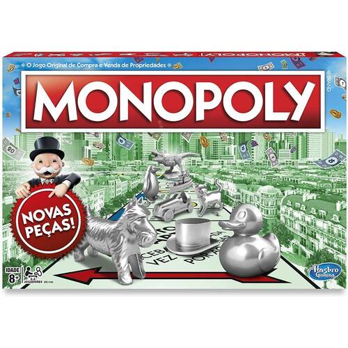 Há um novo milionário na cidade! Os jogadores devem comprar e vender propriedades, cobrar aluguel e construir um império no jogo Monopoly para adultos e crianças a partir de 8 anos.