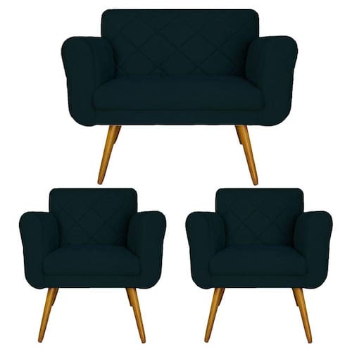 Jogo Namoradeira e 2 Poltrona Decorativa Para Recepção Isabella Suede Azul Marinho - LM DECOR