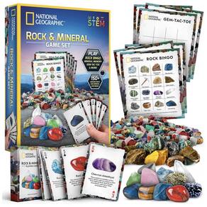 Descubra a geologia de forma envolvente com o jogo National Geographic Rock Bingo! Este conjunto oferece diversão e aprendizado com jogos como bingo de rochas, memória de minerais, trívias de gemas e cartas colecionáveis com mais de 150 rochas e minerais. Além dos jogos, as crianças recebem 25 espécimes de rochas e uma ampla variedade de gemas. As cartas contêm fatos fascinantes sobre as rochas e gemas, podendo ser usadas em jogos de cartas tradicionais ou como cartas flash. Incentive a aprendizagem STEM de forma divertida e interativa para crianças a partir de 6 anos!