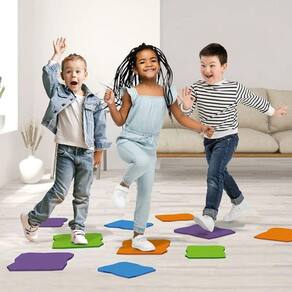 Se equilibre nas pedras para não se queimar! São 20 placas de EVA, 1 roleta e 12 cartas para brincar.