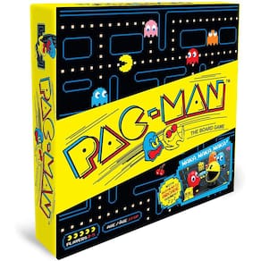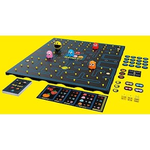 PAC-MAN - O Jogo de Tabuleiro Redescobre o clássico do fliperama de novo! Domine o labirinto, vença os fantasmas, pegue suas iniciais pela pontuação alta! Fique alerta, mova-se rápido, e seja esperto. Desça as pelotas de energia e coma os fantasmas por pontos extras neste jogo colaborativo e competitivo. O jogo contém 1 tabuleiro de jogo de labirinto (4 partes), 1 peão eletrônico PAC-MAN, 4 peões fantasmas, 35 cartas fantasmas nível 1, 5 cartões fantasmas nível 2, 3 dados amarelos PAC-MAN, 4 tokens de olhos fantasmas, 4 tokens de pelota de energia, 16 tokens fantasmas azuis, 3 tokens de frutas, 3 tokens de vida PAC-MAN, 4 peças de pontuação, 1 nota de pontuação alta.