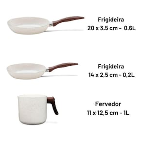 O conjunto é composto por seis peças: duas caçarolas com tampas (22x10,5 cm e 3,55 litros e 20x9,5 cm e 2,55 litros), duas frigideiras (20x3,5 cm e 0,6 litro e 14x2,5 cm e 0,2 litro), uma panela com tampa (16x8 cm e 1,25 litro) e um fervedor (11x12,5 cm e 1 litro). Nesta versão, a cor da pintura externa é vanilla.