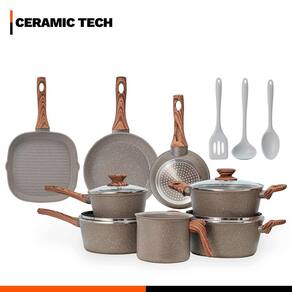 Distribuído por feheros shop Jogo de panelas 11 peças 4mm indução revestimento cerâmico antiaderente Atenção As panelas com revestimento cerâmico possuem propriedades antiaderentes que ajudam a evitar que os alimentos grudem porém não são 100% antiaderentes e podem exigir pequena quantidade de óleo ou para melhor desempenho. - certificação inmetro nível a - evite que a chama do fogão atinja as laterais das panelas - leia atentamente a descrição e siga as recomendações do fabricante - para evitar manchas de óleo limpe a parte externa com um pano úmido durante o uso Informações do produto O jogo de panelas 11 peças foi desenvolvido para quem cozinha diariamente e busca praticidade com visual premium, reunindo corpo em alumínio de 4 mm e múltiplas camadas de revestimento cerâmico que evitam que os alimentos grudem, facilitam a limpeza e permitem cozinhar com menos óleo, preservando o sabor dos alimentos. Compatível com fogões a gás, elétricos, vitrocerâmicos e por indução, o conjunto conta com fundo para indução que aquece rapidamente e distribui o calor de forma uniforme, reduzindo o tempo de preparo e contribuindo para economia de energia. Para completar, o kit inclui três utensílios de silicone de alta resistência que protegem o revestimento cerâmico e prolongam a vida útil das peças. Especificações técnicas do produto - compatível com fogões a gás elétricos vitrocerâmicos e por indução oferecendo versatilidade para diferentes cozinhas - revestimento cerâmico antiaderente livre de pfoa que facilita a limpeza e permite cozinhar com menos óleo - cabos e pegadores em baquelite com revestimento soft touch macio que não esquentam e garantem conforto e segurança no manuseio - fundo triplo de indução que aquece rapidamente e distribui o calor de forma uniforme economizando tempo e energia no preparo das refeições - utensílios em silicone premium resistentes ao calor e seguros para uso em revestimentos antiaderentes ajudando a preservar o acabamento cerâmico por mais tempo Ficha técnica do produto - caçarola 18 cm 18 x 8,5 cm 1,7 l - caçarola 22 cm 22 x 10 cm 3,2 l - panela 16 cm 16 x 8,5 cm 1,3 l - panela 18 cm 18 x 8,5 cm 1,7 l - frigideira 16 cm 16 x 4 cm 0,6 l - frigideira 22 cm 22 x 4,7 cm 1,45 l - grill 24 cm 24 x 4 cm 1,5 l - leiteira 14 cm 14 x 12 cm 1,8 l - colher de silicone 29 x 6,5 cm - concha de silicone 29 x 9 cm - espátula de silicone 29,5 x 7 cm Antes do primeiro uso - lave com esponja macia e detergente líquido - seque bem com pano seco - aplique fina camada de óleo vegetal na parte interna - leve ao fogo baixo por 2 minutos - deixe esfriar lave novamente e seque antes de usar Após o uso - evite choques térmicos e aguarde esfriar antes de lavar - lave manualmente com água morna sabão neutro e esponja macia - para remover resíduos deixe de molho em água por alguns minutos - não use produtos ou esponjas abrasivas - não é indicado o uso em lava-louças Itens inclusos no pacote - 01 caçarola 18 cm revestimento cerâmico 1,7 l com tampa - 01 caçarola 22 cm revestimento cerâmico 3,2 l com tampa - 01 panela 16 cm revestimento cerâmico 1,3 l com tampa - 01 panela 18 cm revestimento cerâmico 1,7 l com tampa - 01 frigideira 16 cm revestimento cerâmico 0,6 l - 01 frigideira 22 cm revestimento cerâmico 1,45 l - 01 grill 24 cm revestimento cerâmico 1,5 l - 01 leiteira 14 cm revestimento cerâmico 1,8 l - 01 espátula de silicone 29,5 cm - 01 concha de silicone 29 cm - 01 colher de silicone 29 cm Todas as fotos são reais dos produtos. Qualquer dúvida, estamos à disposição Dúvidas frequentes 01 - os produtos são novos possuem R: sim são novos e contam com 3 meses de do fabricante
