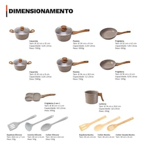 Distribuído por feheros shop Jogo de panelas 11 peças 4mm revestimento cerâmico premium indução Atenção As panelas com revestimento cerâmico possuem propriedades antiaderentes, mas não são 100% antiaderentes. Para melhores resultados, recomenda-se o uso de pequenas quantidades de óleo. O revestimento cerâmico é uma alternativa saudável e ecológica, pois não libera substâncias tóxicas quando aquecido. - panelas premium com certificação inmetro nível a - não deixe a chama do fogão pegar nas laterais das panelas - leia atentamente a descrição e siga as recomendações do fabricante Informações do produto Este conjunto completo oferece versatilidade e sofisticação para a sua cozinha. Compatível com todos tipos de fogão, inclusive por indução, suas peças são fabricadas com revestimento cerâmico de alta qualidade, que garante durabilidade, resistência e maior segurança alimentar. Livre de pfoa e ptfe, é uma opção saudável e sustentável. O design moderno com acabamento premium valoriza o ambiente e proporciona aquecimento rápido e uniforme, otimizando o tempo de preparo e reduzindo o consumo de energia. Especificações técnicas - compatível com fogões a gás, elétricos, vitrocerâmicos e de indução - revestimento cerâmico em 3 camadas com espessura de 4 mm - cabo de baquelite com revestimento soft touch, confortável e seguro - livre de pfoa e classificado como nível a no inmetro - fundo triplo com base de indução: estrutura que combina alumínio e revestimento cerâmico - revestimento: 2 camadas cerâmicas + 1 camada resistente a alta temperatura Ficha técnica do produto - panela 16 cm: d 16 cm x a 8,5 cm c 1300 ml p 730 g - panela 20 cm: d 20 cm x a 9 cm c 2250 ml p 1050 g - caçarola 20 cm: d 20 cm x a 9 cm c 2250 ml p 1080 g - caçarola 22 cm: d 22 cm x a 10 cm c 3250 ml p 1350 g - leiteira 14 cm: d 14 cm x a 10,5 cm c 2000 ml p 350 g - frigideira 18 cm: d 18 cm x a 4 cm c 750 ml p 300 g - frigideira 22 cm: d 22 cm x a 4,7 cm c 1450 ml p 500 g - frigideira grill 3 em 1: 18 x 18 cm x a 2 cm p 600 g - colher silicone 29 cm: 29 cm x l 6,5 cm p 120 g - concha silicone 29 cm: 29 cm x l 9 cm p 110 g - espátula vazada silicone 29,5 cm: 29,5 cm x l 7 cm p 110 g Importante: d = diâmetro, a = altura, c = capacidade, p = peso Antes do primeiro uso - lave com esponja macia e detergente - seque com pano macio - aplique um pouco de óleo na parte interna - leve ao fogo baixo por 2 minutos - desligue o fogo e espere esfriar - lave novamente e seque Após o uso - evite choques térmicos. Deixe esfriar antes de lavar - lave à mão com água morna, esponja macia e detergente - enxágue e seque com pano macio - para alimentos queimados, deixe de molho e lave - não utilize utensílios metálicos, objetos afiados ou produtos abrasivos Itens inclusos no pacote - 01 panela 16 cm com tampa de vidro - 01 panela 20 cm com tampa de vidro - 01 caçarola 20 cm com tampa de vidro - 01 caçarola 22 cm com tampa de vidro - 01 leiteira 14 cm - 01 frigideira 18 cm - 01 frigideira 22 cm - 01 frigideira grill 3 em 1 18cm - 01 colher silicone 29 cm premium - 01 concha silicone 29 cm premium - 01 espátula vazada silicone 29,5 cm premium acompanha - 01 espátula vazada de bambu - 01 colher vazada de bambu - 01 colher para arroz de bambu Todas as fotos são reais dos produtos. Qualquer dúvida, estamos à disposição Dúvidas frequentes 01 - o produto pode ir ao forno R: não, este conjunto não é adequado para uso no forno devido ao cabo em baquelite 02 - o produto é novo Possui 03 - é compatível com fogão de indução R: sim, o conjunto possui fundo especial que permite o uso em fogões de indução, além de fogões a gás, elétricos e vitrocerâmicos