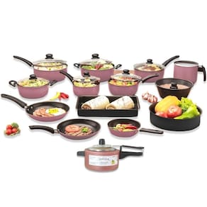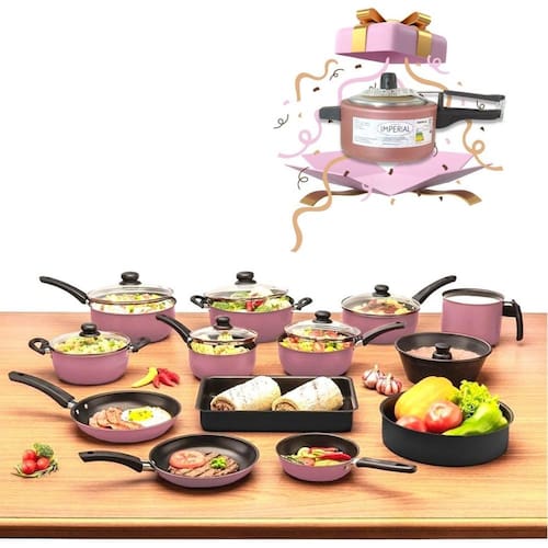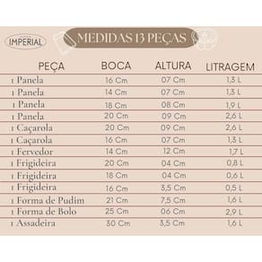 01 - panela de 14cm de diâmetro 01 - panela de 16cm de diâmetro 01 - panela de 18cm de diâmetro 01 - panela de 20cm de diâmetro 01 - caçarola de 16 cm de diâmetro 01 - caçarola de 20 cm de diâmetro 01 - fervedor de 14 cm de diâmetro 01 - frigideira de 16 cm de diâmetro 01 - frigideira de 18 cm de diâmetro 01 - frigideira de 20 cm de diâmetro 01 - forma de bolo 25 cm de diâmetro 01 - forma de bolo 30 cm de diâmetro 01 - assadeira retangular 30 cm de diâmetro 01 - panela de pressão 2 litros