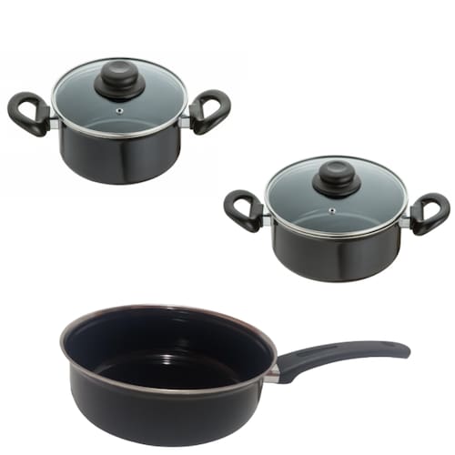 Este produto produzido em aço e é revestido por dupla camada de esmalte, sendo assim mantendo o calor por mais tempo, cozimento rápido, economizando até 30% de gás. 3 unidades que possuem alças reforçadas e confortáveis mantendo sempre um padrão elegante.