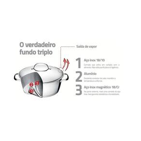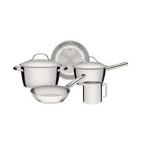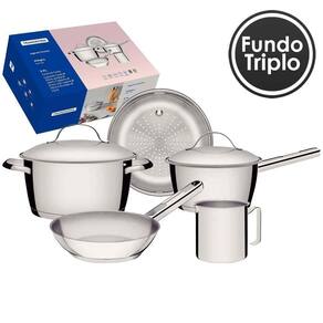 Jogo De Panelas Em Aço Inox 5 Peças Allegra TramontinaCARACTERÍSTICAS- O Jogo de Panelas Tramontina 5 Peças da Linha Allegra vai virar seu melhor amigo na cozinha. São projetadas para facilitar a preparação das mais variadas receitas. Elas são produzidas em aço inox e trazem a alta durabilidade e bom gosto do material. São ainda muito estilosas, tornando a aparência da sua cozinha e mesa mais interessante e bonita.- Apresentam ainda fundo triplo (aço inox + alumínio + aço inox), característica que distribui o calor de forma igual, cozinhando os alimentos mais rapidamente e com menos gasto de energia. Ainda se mostram muito versáteis, podendo ir ao forno e a diferentes tipos de fogões. São peças perfeitas para acompanhar você nos momentos mais saborosos do dia.- Mais saudável: por ser feita de aço inoxidável, a panela Tramontina não libera nenhum tipo de resíduo nas suas receitas;- Fácil de utilizar: uma panela prática para todas as suas receitas e que faz bonito em qualquer tipo de fogão: gás, elétrico, vitrocerâmico e indução. Ainda possui tampa com saída de vapor e encaixe perfeito. Mais durável: o inox Tramontina é uma matéria-prima nobre, resistente e que vai fazer bonito por muito mais tempo na cozinha;- Economiza tempo e energia: o segredo está no fundo triplo (aço inox + alumínio + aço inox), que distribui o calor uniformemente, proporcionando um cozimento mais rápido;- Por isso, você pode manter o fogo baixo durante todo o preparo e, assim, poupar energia. Além disso, a panela toda em aço inox pode ir ao forno para gratinar ou finalizar pratos, na temperatura máxima de 260°C;- Fácil de limpar: deixar sua panela brilhando é simples, você só precisa de água, sabão e uma esponja macia. Se preferir, é só colocar na máquina de lavar.RECOMENDAÇÕES DE UTILIZAÇÃO:- A capacidade volumétrica máxima para cozimento é de 3/4 da capacidade total da peça. Antes da utilização, remova as eventuais etiquetas presentes no produto, e em seguida recomendamos lavar;- Use uma fonte de calor sempre baixa, para evitar que o alimento grude no fundo da panela.- O fundo triplo distribui uniformemente o calor, não sendo necessário o fogo alto. E, além disso, você economiza energia. Quando a panela for utilizada no fogão a gás, a chama não deve ultrapassar a base da panela. No caso de utilização de chapa elétrica, a chapa deverá ter diâmetro igual ou inferior ao da panela;- Não aqueça o alimento colocando uma panela ou qualquer utensílio do mesmo diâmetro um sobre o outro. Esse procedimento é perigoso, pois cria vácuo e impossibilita a retirada. Não deixe a panela vazia sobre uma fonte de calor;- Sempre dissolva o sal em água fervendo ou com os alimentos, mexendo os ingredientes no início do cozimento. Alguns alimentos que possuem amido, como massa e arroz, poderão deixar manchas na parte interna da panela durante o cozimento. Para remover facilmente as manchas, passe um pano umedecido com suco de limão ou vinagre, ou utilize a pasta Tramontina para polir e remover manchas;- Evite deixar alimento na panela por muito tempo; o sal também pode provocar manchas e corrosão. Para que a panela de aço inox fique sempre bonita e com brilho, recomendamos que seja lavada somente com detergente neutro e esponja. Além disso, nas partes foscas da panela pode-se utilizar o lado mais abrasivo da esponja com saponáceo líquido, para remover as manchas mais difíceis. Depois da lavagem, sempre que possível, enxágue a panela com água quente e seque-a imediatamente, para que ela mantenha o brilho, pois o cloro e as substâncias contidas na água podem deixar manchas na panela. Nas panelas/tampas cujo sistema de fixação utiliza para utilização, com o tempo de utilização ele poderá afrouxar-se. Recomenda-se, por segurança, o reaperto. Pode ir ao forno em temperatura máxima de 260°C, podendo haver mudança na coloração. As alças, pegadores e cabos aquecem durante o cozimento. Aconselhamos a utilização de luvas ou pano no manuseio. É necessário cuidado ao manusear o produto, principalmente com alimentos ou líquidos quentes. Para sua segurança, utilize somente até a capacidade máxima indicada no fundo do produto.ESPECIFICAÇÕES:- Marca: Tramontina- Modelo: 65660280 ALLEGRA- Cor: Inox- Garantia: 3 mesesITENS INCLUTILIZAÇÃOS / DIMENSÕES- 1 Caçarola funda Ø 20cm 3,1 L- 1 Cozi-vapore Ø 20cm 2,1 L- 1 Frigideira Ø 20cm 1,1 L- 1 Panela Ø 16cm 1 L- 1 Fervedor Ø 12cm 1,1 LDIMENSÕES- Dimensões da embalagem (Compr. X Larg. X Alt.): 439x273x211 mm- Peso 3,76kg*IMAGENS MERAMENTE ILUSTRATIVAS*
