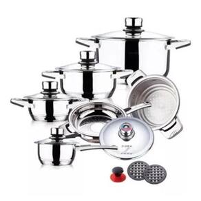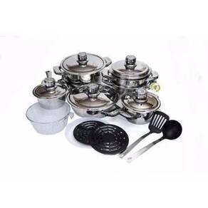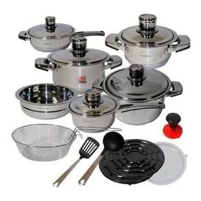 Jogo de panelas aço inoxidavel de luxo 23 peças - fundo 9 camadas Jogo de panelas antiaderente alemã - aço cirúrgico 23 peças - luxo Melhor panela do mundo, peças em açõ cirurgico alemã. Certificado de mundial, Utilizado pelos melhores chefes de cozinha do mundo. A royal tem e acabou de chegar no brasil. Oportunidade de compra agora pra voce que quer ter uma comida de boa qualidade com a melhor panela do mundo. Enviamos para todo brasil. 23 peças - 11 camadas de cerâmica Antiaderente aço cirúrgico 18/10 gramatura termostato de 1 ano pelo fabricante Jogo de panelas 12 peças royal 01 - 1 caçarola 6.5 litros medindo 24cmx14cm com tampa 02 - 1 caçarola 3.0 litros medindo 20cmx10cm com tampa 03 - 1 caçarola 1.6 litros medindo 16cmx08cm com tampa 04 - 1 frigideira 3.0 litros medindo 24cmx6.5cm com tampa 05 - 1 panela 1.6 litros medindo 16cmx09cm com tampa 06 - 1 panela vaporizadora medindo 20cmx10cm 07 - 1 fritadeira medindo 18cm mais, 11 utencilios para cozinha 08 - 02 bakelite suporte de panelas 09 - 01 conjuto de útensilios nylon 6 peças 10 - 1 botão sucção 11 - 1 livro de receita em 3 linguas alemão,russo e inglês 12 - cartão de certificação de fábrica tampas com termometro. Caixa totalmente lacrada. de 12 meses contra defeitos de fabricação Peso: 11.2kg.