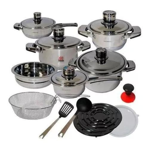 Jogo de panelas aço inoxidavel de luxo 23 peças - fundo 9 camadas Jogo de panelas antiaderente alemã - aço cirúrgico 23 peças - luxo Melhor panela do mundo, peças em açõ cirurgico alemã. Certificado de mundial, Utilizado pelos melhores chefes de cozinha do mundo. A royal tem e acabou de chegar no brasil. Oportunidade de compra agora pra voce que quer ter uma comida de boa qualidade com a melhor panela do mundo. Enviamos para todo brasil. 23 peças - 11 camadas de cerâmica Antiaderente aço cirúrgico 18/10 gramatura termostato de 1 ano pelo fabricante Jogo de panelas 12 peças royal 01 - 1 caçarola 6.5 litros medindo 24cmx14cm com tampa 02 - 1 caçarola 3.0 litros medindo 20cmx10cm com tampa 03 - 1 caçarola 1.6 litros medindo 16cmx08cm com tampa 04 - 1 frigideira 3.0 litros medindo 24cmx6.5cm com tampa 05 - 1 panela 1.6 litros medindo 16cmx09cm com tampa 06 - 1 panela vaporizadora medindo 20cmx10cm 07 - 1 fritadeira medindo 18cm mais, 11 utencilios para cozinha 08 - 02 bakelite suporte de panelas 09 - 01 conjuto de útensilios nylon 6 peças 10 - 1 botão sucção 11 - 1 livro de receita em 3 linguas alemão,russo e inglês 12 - cartão de certificação de fábrica tampas com termometro. Caixa totalmente lacrada. de 12 meses contra defeitos de fabricação Peso: 11.2kg. Marca: Não Informado