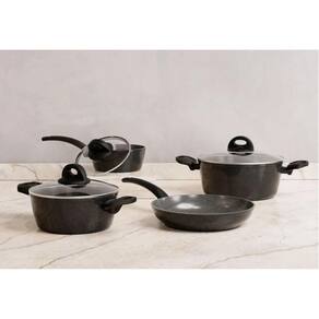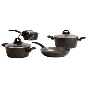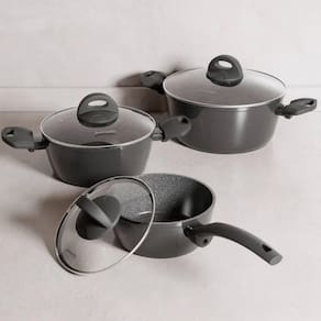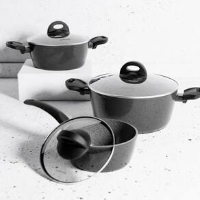 Jogo Panelas Antiaderente Revestimento Cerâmica 4pç Black Conjunto de Panelas Ibiza Black Stone 4 Peças: Qualidade e praticidade na sua cozinha. Cabo e alças de soft touch para conforto e firmeza no manuseio, com redução da propagação de calor. Revestimento cerâmico antiaderente que não gruda e facilita a limpeza, resultando em menos uso de óleo. Tampa de vidro temperado com saída de vapor. Inclui 4 peças: caçarola com tampa 24cm , caçarola com tampa 20cm , panela 16cm e frigideira 24cm .