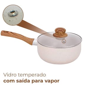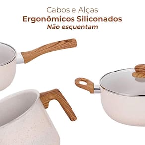 As peças do conjunto possuem cabos e alças com acabamento siliconado Soft-Touch amadeirado, que dão um toque macio e não esquentam, evitando acidentes.