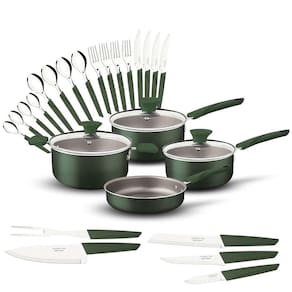 CARACTERÍSTICASO que você precisa para completar sua cozinha, está presente no kit cozinha Tramontina Lyf verde natureza 25 peças. Ideal para quem preza pela sustentabilidade, ele tem suas peças de fogão desenvolvidas com corpo de alumínio com revestimento interno e externo de antiaderente Starflon Max, material que não gruda e é super fácil de limpar.Os cabos, alças e pegadores são de polímero 100% reciclável, material que oferece segurança e torna o manuseio muito mais confortável.O kit de cozinha ainda vem com facas para o preparo dos alimentos e talheres para lhe acompanhar nas principais refeições.Toda linha é 100% reciclável e mantém o conceito de que a sustentabilidade é um ciclo, a Tramontina apresenta uma linha fluida, inspirada nas folhas e no vento. Tramontina LYF: a escolha mais sustentável para sua cozinha!Pode ser utilizada nos fogões: gás, elétrico e vitrocerâmicoCONTEÚDO DO JOGO- 01 Panela Ø 16 cm 1,5 L LYF- 01 Panela Ø 18 cm 2,1 L LYF- 01 Caçarola Ø 20 cm 2,9 L LYF- 01 Frigideira Reta Ø 20 cm 1,4 L- 04 Colheres de Mesa LYF- 04 Colheres para Chá LYF- 04 Facas de Mesa 4"- 01 Faca Chef 7" LYF- 01 Faca para Desossar 5" LYF- 01 Faca para Legumes e Frutas 3"- 01 Faca para Pão 7" LYF- 01 Garfo Trinchante LYF- 04 Garfos de Mesa LYFESPECIFICAÇÃO- Marca: Tramontina- Modelo: 28399205- Linha: Lyf Verde natureza- Material:- Panelas: alumínio com revestimento antiaderente Starflon- Cabos e alças em termoplástico de Engenharia e pegadores de nylon- Facas e talheres: lâminas de aço inox e cabos de polipropileno PCR.- Quantidade: 25 peças- Dimensões da embalagem:- Altura: 13,50cm- Largura: 29,10cm- Comprimento: 49,00cm- Peso: 4Kg Ean: 7891112326828