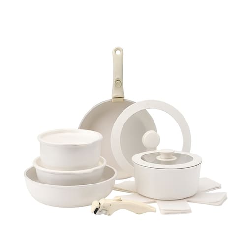 Jogo Panelas Cerâmica Antiaderente Com Cabo RemovívelA panela de cerâmica antiaderente é ideal para quem busca praticidade e saúde no dia a dia. Com revestimento cerâmico premium, permite cozinhar com menos óleo sem que os alimentos grudem, além de facilitar a limpeza.CaracterísticasMaterial premium: Fabricado em cerâmica com revestimento antiaderente de alta qualidade, livre de PFOA e PTFE.Design moderno: Cor branca elegante com detalhes em madeira e silicone, ideal para combinar com qualquer estilo de cozinha.Cabos removíveis: Sistema de encaixe seguro que facilita o armazenamento e a limpeza.Tampa de vidro temperado: Resistente ao calor, com saída de vapor para melhor controle no preparo.Compatibilidade: Funciona em fogões a gás, elétricos, vitrocerâmica e indução (base reforçada).Benefícios:Cozinhar sem óleo: O revestimento antiaderente permite preparar receitas mais saudáveis.Fácil de limpar: Superfície lisa que não gruda, economizando tempo na hora da limpeza.Armazenamento prático: As peças são empilháveis, ocupando menos espaço no armário.Versatilidade na cozinha: Ideal para fritar, refogar, assar e até servir diretamente à mesa.Durabilidade: Estrutura reforçada, garantindo maior vida útil ao produto.O que contém na caixa:1 Panela 18cm1 Panela 20cm 1 Frigideira 20cm1 Frigideira 26cm1 Frigideira Funda 26cm 1 Tampa Silicone 20cm 1 Tampa Silicone 26cm 2 Cabos 1 Tampa Pequena 18cm1 Tampa Pequena 20cm3 Utensílios de silicone4 Descansos de panela em feltro para evitar riscos durante o empilhamentoEste Kit Completo de Panelas em Cerâmica Antiaderente é a escolha perfeita para quem busca praticidade, saúde e elegância na cozinha! Marca: Não Informado