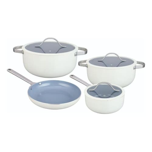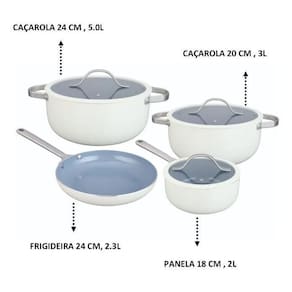 Vantagens: Revestimento cerâmico Antiaderente e livre de PFOA Alumínio reforçado Aquecimento rápido e uniforme Cabos resistentes Firmeza e segurança no manuseio Tampas encaixáveis Retenção ideal de calor e umidade Cor branca Ajusta-se a qualquer estilo de decoração