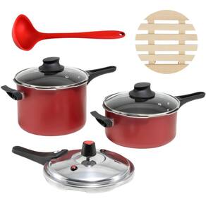 Jogo de Panelas 2 em 1 Fechamento Externo e Tampa de Vidro Marcolar A Panela Antiaderente com Fechamento Externo da Marcolar é a solução ideal para quem busca praticidade na cozinha, permitindo preparar refeições saborosas de maneira rápida e eficiente. Essa panela oferece conveniência incomparável. Com duas opções de tampas, você pode cozinhar com a tampa e, logo em seguida, trocar para a tampa de vidro e levar a panela diretamente à mesa. Economize tempo e reduza o número de louças a serem lavadas, sem abrir mão de um design sofisticado. Além disso, o fechamento externo proporciona maior segurança e facilidade no manuseio, enquanto as tampas de vidro temperado com saída de vapor asseguram um cozimento uniforme. DIFERENCIAIS - Fechamento Externo: Mais seguro e fácil de manusear, oferecendo um uso prático no dia a dia. - Revestimento Antiaderente: Evita que os alimentos grudem, facilitando tanto o preparo quanto a limpeza. - Tampas de Vidro: Duas tampas com saída de vapor para servir diretamente à mesa sem perder o calor dos alimentos. ESPECIFICAÇÕES TÉCNICAS Material: Alumínio Cor: Cereja Compatibilidade: Ideal para fogões a gás ITENS INCLUSOS 01 Panela 4,5L 01 Panela 3L 02 Tampas de Vidro 02 Descansos de Panela 01 Concha de Silicone Leve a praticidade e qualidade Marcolar para sua cozinha e transforme suas refeições Marca: Não Informado