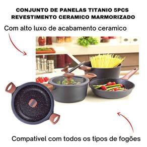 Descrição:Conjunto panelas 10 peças Titanium para Fogão Indução Revestimento Cerâmico Marmorizado. O conjunto de panelas 10 peças Titanium, o seu material é de alumínio injetado de 5 mm de espessura, tampas de vidro temperado com anel de silicone com cabos em soft-touch e também é compatível com todos os tipos de fogões. Um design diferenciado que você só encontra com a MTA. Revestimento Cerâmico Marmorizado de alta performace.Itens Inclusos:2 Panela N16 - 1,4L2 Caçarola N20 - 2,4L2 Caçarola N24 - 4,3L2 Frigideira Alta N20 - 1,1L2 Frigideira Alta N24 - 1,9L Instruções de uso: - Antes de usar, lave e enxugue a suas panelas por completo. - Não coloque a peça vazia para aquecer. - Ao utilizar a peça em fogão a gás, a chama não deve ultrapassar a base, em fogões elétricos ou vitro-cerâmicos, o diametro da boca deverá ser igual ou inferior ao do fundo da peça. Isso evita que o alimento queime. Limpeza e conservação: - Para manter o brilho da seu jogo belga, lave somente com uma esponja macia, detergente ou sabão neutro. Não use lã de aço ou outros abrasivos - Para mexer ou retirar os alimentos use utensilios de silicone, nylon, polipropileno ou madeira. Não use objeatos pontiagudos, não raspe e não corte o alimento dentro da peça, para não riscar. - Evite água com excesso de cloro, para evitar manchas. - Deixe a peça esfriar antes de lavar em água fria. Isso facilita a limpeza - Caso a comida quieime, deixe a peça esfriar e coloque-a de molho em água por alguns minutos antes de lavar.