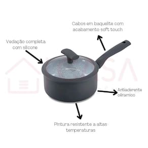 Jogo de Panelas Hercules Revestimento Ceramico Indução 4 Peças Antiaderente Cinza Descrição: A linha Soft Touch da Hercules garante melhor desempenho, funcionalidade e qualidade para a sua cozinha e no preparo das refeições. Com revestimento antiaderente cerâmico. Produzida com materiais resistentes: Alumínio, silicone, vidro e baquelite. Ideal para uso em fogão convencional, fogão halogênio e de indução. Não utilizar no forno, micro-ondas, geladeira e freezer. Sua cozinha pode ser prática, saudável e muito bonita. As panelas da Hércules oferecem o que há de mais moderno para o preparo das refeições diárias. Características: Espessura de 3 milímetros, tampa de vidro com acabamento em silicone, além de muito bonita causa impressão de sofisticação na cozinha. Os cabos em silicone soft touch dão maciez e estabilidade no manuseio da panela além de serem isotérmicos e não esquentarem. O Interior antiaderente em cerâmica facilita o preparo e a limpeza além de não liberar componentes tóxicos na preparação dos alimentos, a construção da panela com fundo especial possibilita sua utilização. - Pode ir em lava-louças; - Pode ir em fogões por indução; - Material Panelas, frigideira e caçarolas : Alumínio, Silicone, Vidro e Baquelite. Composição: Quantidade 4 Peças; 1- Caçarola 20 x 9 cm - espessura 3mm - 2.5L; 1- Panela 18 x 9 cm - espessura 3mm - 1.75L; 1- Panela 20 x 9 cm - espessura 3mm - 2.5L; 1- Frigideira 20 x 5cm - espessura 3mm - 1.2L; Especificações: Marca: Hércules; Modelo: Soft Touch; : 3 meses. Marca: Não Informado