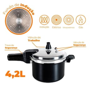 A Panela de Pressão Pressure conta com estrutura de alumínio com um fechamento externo muito mais seguro, sua parte externa possui pintura na cor preta fosca trazendo mais sofisticação para a sua cozinha e a parte interna é feita em alumínio com antiaderente cerâmico Pro-Ceramic. Suas alças são feitas em tecnologia soft -touch proporcionam mais conforto e melhor manuseio, já que possuem toque macio, resistente e não esquentam. possui 2 anos de garantia e 4 dispositivos de segurança uma trava, duas válvulas de trabalho e um escape de segurança .
