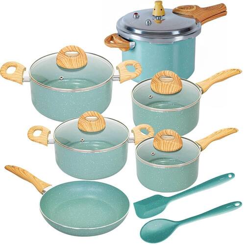 O jogo de panelas possui design inovador, produzida na cor verde com cabos amadeirados, o que com certeza é um diferencial quando estão expostas.
