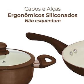O conjunto é composto por 10 peças na cor marrom, duas caçarolas, duas panelas com cabo, duas frigideiras, uma leiteira e 3 utensilios de nylon, um kit completo que facilitará o preparo de suas refeições no dia a dia.