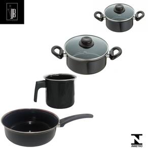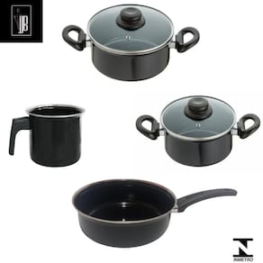 Jogo De Panelas Esmaltadas para Fogão De Indução, Elétrico, á Gás, Elétrico e a Lenha Panelas com revestimento vitro-cerâmico. Mais segurança e economia para sua casa.Conjunto de panelas esmaltada 4 peças com tampa de vidro e aro de inox, design moderno e prático, que facilita o manuseio e a limpeza, não soltam resíduos, como panelas de alumínio, teflon e ferro.Com revestimento esmaltado ela é mais durável e higiênica, não transmitindo gosto ou odores, mantendo o verdadeiro sabor.Superfície lisa, adequado para todos os tipos de fogões.São próprias para fogão de indução, a gás, elétrico e fogão a lenha, podendo ir ao freezer e a lava-louça para facilitar sua experiência na cozinha do dia a dia.Este produto produzido em aço e é revestido por dupla camada de esmalte, sendo assim mantendo o calor por mais tempo, cozimento rápido, economizando até 30% de gás. 4 unidades que possuem alças reforçadas e confortáveis mantendo sempre um padrão elegante.Recomenda-se cozinhar sempre em fogo baixo.Sua vida útil pode ser prolongada ainda mais, se for utilizado utensílios de plástico, madeira ou silicone.Itens Inclusos:1 panela 18cm 1,750ml1 panela 20cm 2,150ml1 frigideira 20cm1 Caneca 10cm 750ml1 Tampa 18cm1 Tampa 20cmNÃO PASSUI ANTIADERENTEEspecificações técnicasMarca: JJB UtilidadesModelo: EsmaltadaCor: PretoMaterial: Aço Carbono com revestimento em vitro-cerâmicaAmbientes Recomendados: CozinhaGarantia: 3 meses defeito de Fabricação.