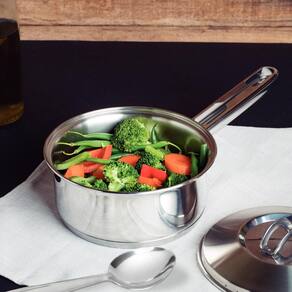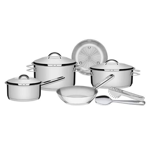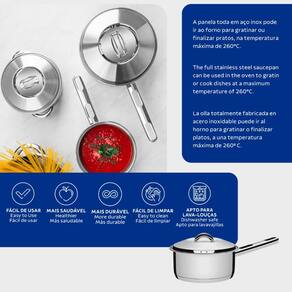 O design clean da linha Solar foi criado para tornar mais simples as tarefas de forno e fogão. O Jogo de Panelas Tramontina Solar em Aço Inox com Fundo Triplo possui um design moderno, com acabamento em alto brilho. O fundo triplo (aço inox + alumínio + aço inox) distribui o calor uniformemente, proporcionando um cozimento mais rápido e uniforme, economizando energia e deixando os alimentos aquecidos por mais tempo. Desenho limpo e sem cantos torna a limpeza mais fácil. Sua tampa tem saída de vapor e encaixe perfeito.