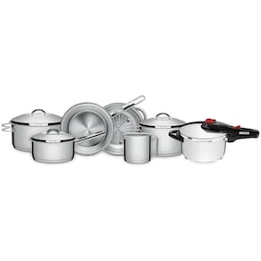 O Jogo de Panelas Tramontina Solar em Aço Inox com Fundo Triplo e Tampas de Inox 7 Peças é um clássico Tramontina. Práticas e duráveis, as seis peças são produzidas totalmente em aço inox, que mantém os alimentos saudáveis já que o material não solta resíduos. Possuem fundo triplo (aço inox + alumínio + aço inox), característica que distribui o calor de forma uniforme, proporcionando um cozimento mais rápido e deixando os alimentos aquecidos por mais tempo, além de economizar mais energia. São peças versáteis que podem ir ao forno para gratinar ou finalizar pratos na temperatura máxima de 260C e ser utilizadas em diferentes tipos de fogões. O fervedor não é indicado para o fogão à indução. Possuem tampa com encaixe perfeito e saída de vapor. São ainda muito estilosas. O acabamento em alto brilho faz delas as melhores escolhas para uma cozinha mais bonita. São fáceis de limpar devido ao desenho sem cantos, além de poderem ir à máquina de lavar louças diariamente. A escolha perfeita para ter um cozinha muito mais completa!