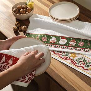 Jogo Pano de Prato Natalino 3 peças 46cmx65cm Karsten O kit Natalino, com três panos de copa, une a funcionalidade do tecido felpudo de alta absorção à beleza das barras decorativas em jacquard. O algodão confere maciez e resistência, tornando a secagem mais rápida e eficiente. Com desenhos festivos e embalagem especial, é ideal para presentear ou renovar o enxoval da cozinha e com um toque natalino que inspira boas memórias. Conta com tag especial para tornar o presente ainda mais significativo. Praticidade e design junto: Na cozinha, cada detalhe conta uma história. O pano de copa, aliado indispensável, é presença constante nos gestos que tornam o cotidiano mais leve e afetuoso. Ele participa dos preparos, acompanha receitas de família e empresta cor e textura ao ambiente. Feitos com o toque do algodão, oferecem alta absorção, maciez e resistência para acompanhar o uso diário. Seu design vai além da utilidade, trazendo estampas, barras decorativas e acabamentos diferenciados, que acrescentam um toque de charme ao ambiente. Além de ser um utensílio, é um item versátil que une beleza e funcionalidade para tornar cada tarefa na cozinha mais prática e agradável. Natal: Natal é a época perfeita para transformar lembranças em momentos de união e aconchego, e cada detalhe da sua casa pode fazer parte dessa magia. O sofá se aquece com mantas macias e almofadas decorativas que abraçam, a mesa ganha vida com toalhas elegantes e guardanapos bordados, e a cozinha se enche de charme com panos de copa e jogos presenteáveis. Cada produto foi pensado para valorizar suas tradições, acolher sua família e criar novos capítulos de histórias que serão lembradas com carinho. A linha Natal tem produtos para preparar sua casa para receber quem você mais ama ou mesmo para presentear com significado. Estar juntos é o que torna tudo mágico.