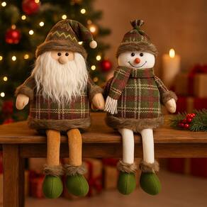 Deixe sua decoração natalina ainda mais charmosa com este conjunto de Papai Noel e Boneco de Neve em pelúcia premium, ambos no modelo sentado com pernas moles, que trazem movimento e delicadeza à composição.