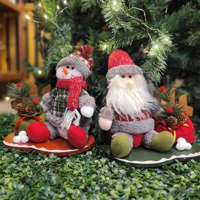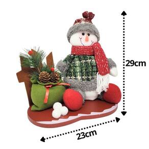 -01 Unidade Boneco de Neve Pelúcia Natal na Cerca Base Madeira 23cm Saco de Presentes decorado Pinhas e Pick