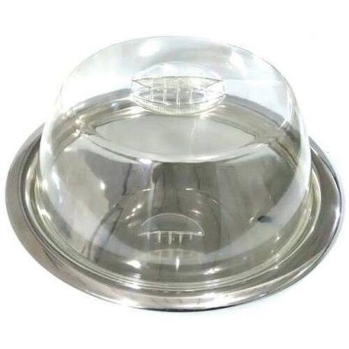 O kit é composto por prato redondo fabricado em aço inoxidável de qualidade com tampa em acrílico.