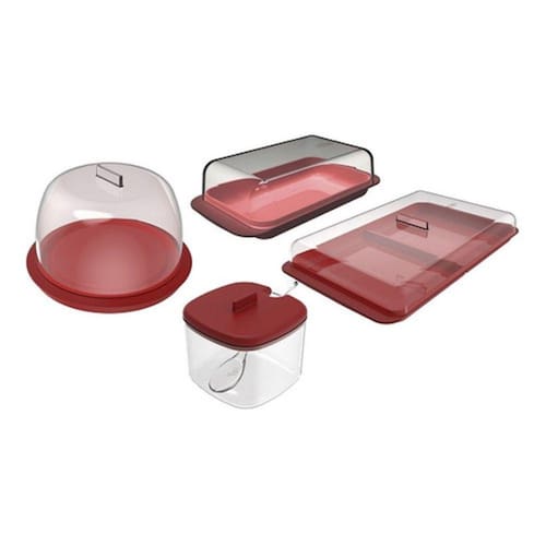 CARACTERÍSTICAS: - Beleza e praticidade no seu dia a dia! - Mantenha a elegância e organização da cozinha e mesa no momento das refeições com um produto certo para armazenar cada tipo de alimento. - O porta frios duplo com tampa acoplada e transparente evita que o pote fique aberto e estrague os produtos, mantendo os alimentos bem fechados e conservados. - A queijeira possui tampa com transparência para fácil visualização dos alimentos, que ao mesmo tempo mantém os alimentos protegidos e com sabor original. - O açucareiro é ideal para deixar o momento na cozinha mais agradável, o utensílio acompanha tampa e colher. - Com a mantegueira, armazena-se de forma a preservar a consistência do alimento.