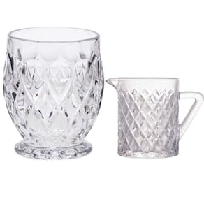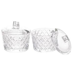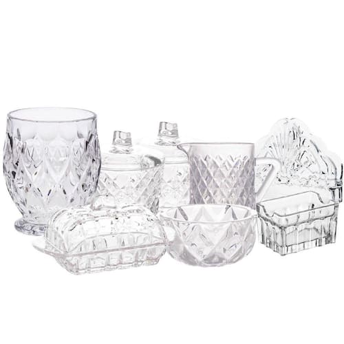 Composição: Começando pela esquerda; 01 Porta Talher de Cristal 10,5x13cm, 02 Açucareiros com 250ml cada, 01 Mantegueira, 01 Jarra ou Cremeira de Cristal com 340ml, 01 Bowl de Cristal 11x5cm, 01 Porta Sache. 01 Porta Guardanapo. Observação: Todos os itens são de Cristal.