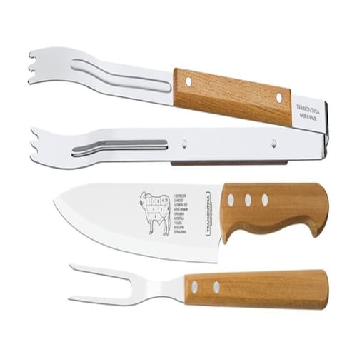 INFORMAÇÕES GERAIS: Lâminas de aço inox. As lâminas das facas têm maior durabilidade do fio devido ao tratamento térmico. O garfo e pegador contam com maior espessura e uma estampagem do aço que garante maior resistência, evitando deformações. Os cabos são de madeira natural. RECOMENDAÇÕES DE USO Antes da primeira utilização, lave bem as peças e seque-as. Tenha cuidado ao manusear produtos cortantes e perfurantes e mantenha-os fora do alcance de crianças. Para maior durabilidade dos produtos, recomenda-se secar lavar manualmente e secá-los antes de guardar. Para descarte dos produtos e embalagens siga as orientações de reciclagem vigentes. Compõem o kit com 3 peças: 1 Faca para carne 8", 1 Garfo Trinchante e 1 Pegador de carne.