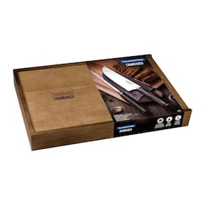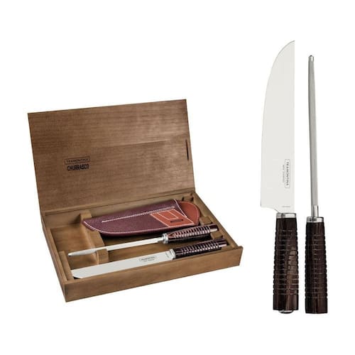 Mais Informações - A lâmina de aço inox da faca têm maior durabilidade do fio devido ao tratamento térmico.Chaira possui haste de aço carbono revestida com cromo-duro que garante uma maior durabilidade e precisão para a afiação.Os cabo de madeira tratada Polywood são resistentes à impactos e alta temperaturas garantindo maior resistência e durabilidade.A bainha em couro que oferece uma proteção ao fio da faca, permitindo o transporte e armazenagem com maior segurança.Estojo de madeira que oferece uma proteção as peças, permitindo o transporte e armazenagem com maior segurança.Pode ir à máquina de lavar louças facilitando seu dia a dia.