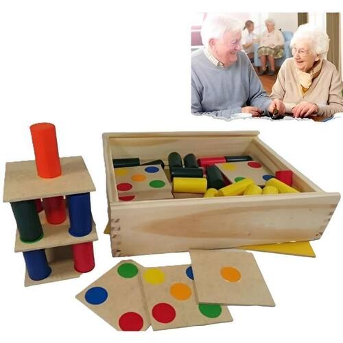 Confeccionado em madeira e M.D.F. - 18 placas em MDF medindo 7,5 x 7,5 cm e 45 cilindros de madeira pintados medindo 3,5 cm de altura, pintados com tinta atóxica nas cores: vermelha, verde, laranja, amarela e azul.
