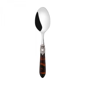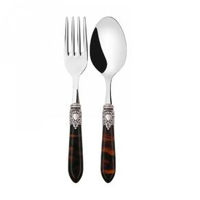 Para garantir uma mesa elegante e com espírito régio o jogo de garfo e colher grande para servir da linha Oxford da Bugatti foi produzido em aço inox 18/10, com cabo de madrepérola em acrílico enriquecido por um sofisticado anel com acabamento em prata antiga que lembra um nobre brasão.