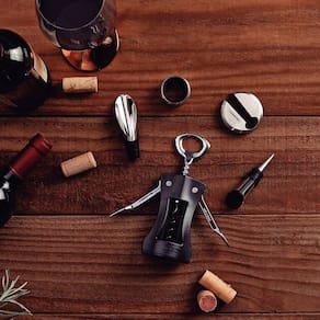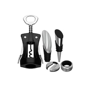 - 1 Abridor / saca-rolhas 1 Corta gotas 1 Corta lacres 1 Tampa 1 Salva Gotas