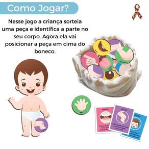 Conteúdo da Embalagem: 1 Saquinho Grande, 1 boneco, 20 Cartas de Curiosidade, 20 Peças com Partes do Corpo